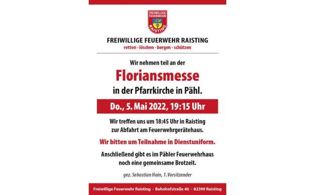 Am Donnerstag, den 05. Mai 2022 um 19.15 Uhr findet in der Pähler Pfarrkirche endlich wieder eine Floriansmesse statt. Nach der Corona-Pause wird die wiederbelebte Tradtion der Zusammenkunft der Feuerwehren der Pfarreiengemeinschaft Pähl – Raisting – Wielenbach zu Ehren des Schutzpatrons der Feuerwehren auf ein Neues gefeiert. Im Anschluß gibt es eine Zusammenkunft der teilnehmenden…